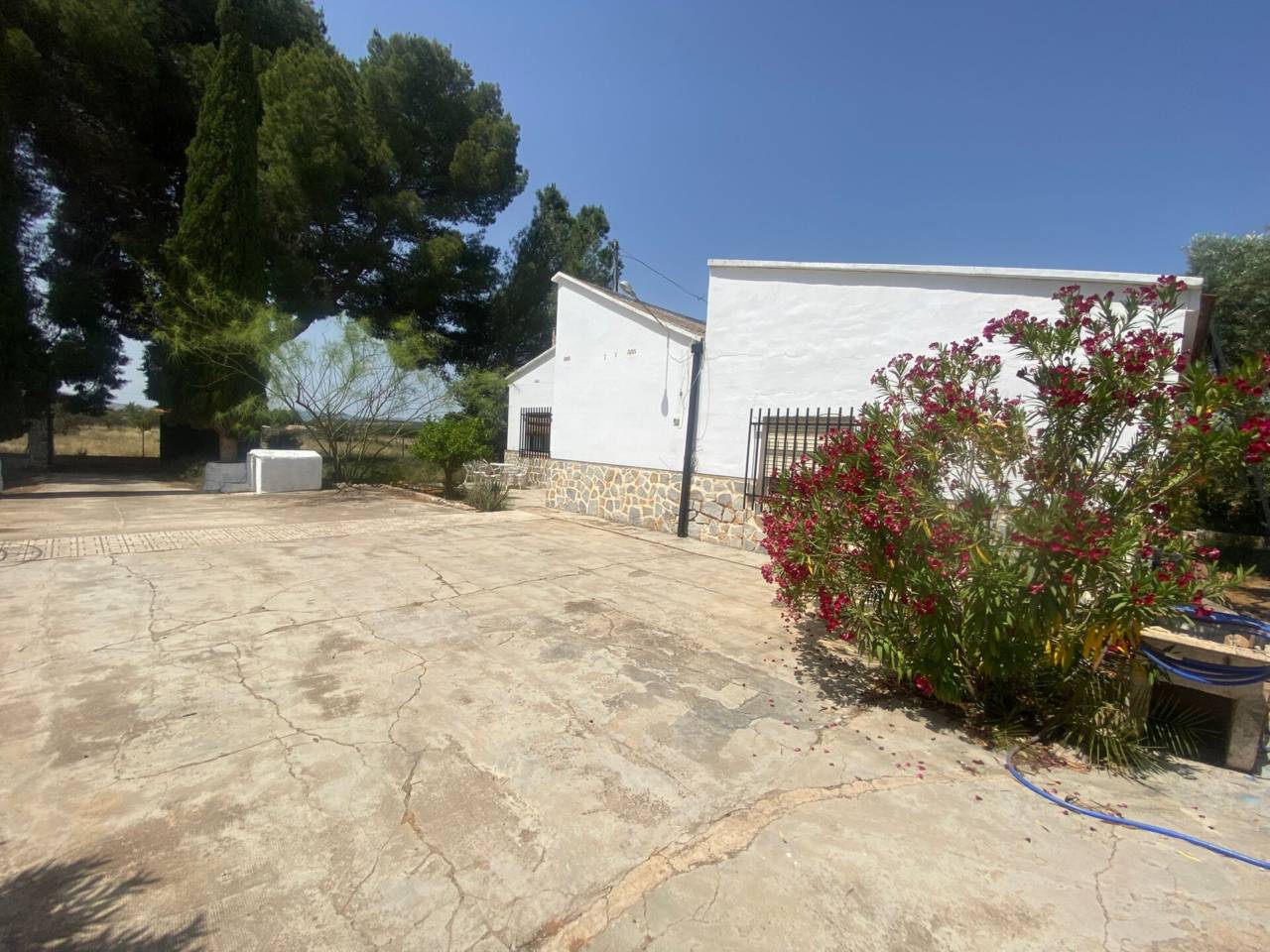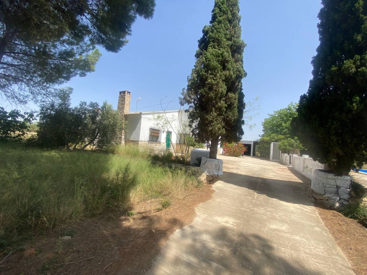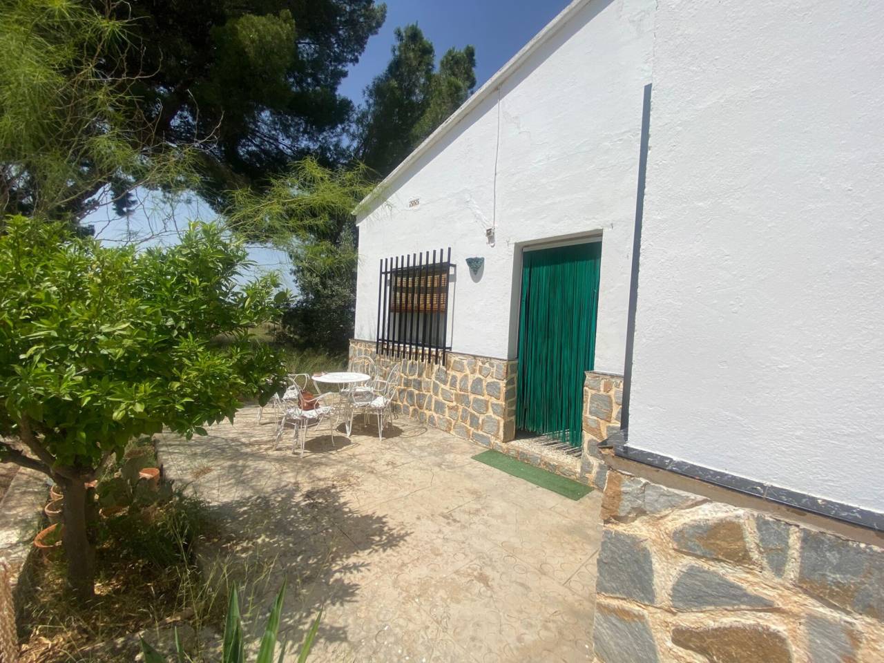 Casa de campo de una planta con parcela de 3.300 m2. En la parcela se encuentra la casa de 150 m2 que se distribuye en 5 habitaciones, cocina amueblada con despensa, salón-comedor con chimenea, baño y aseo. Patio interior amplio. Los suelos son de gres y terrazo, las puertas de sapelli y las ventanas de aluminio y de hierro. Rejas en las ventanas. Piscina con depuradora. La parcela está vallada.