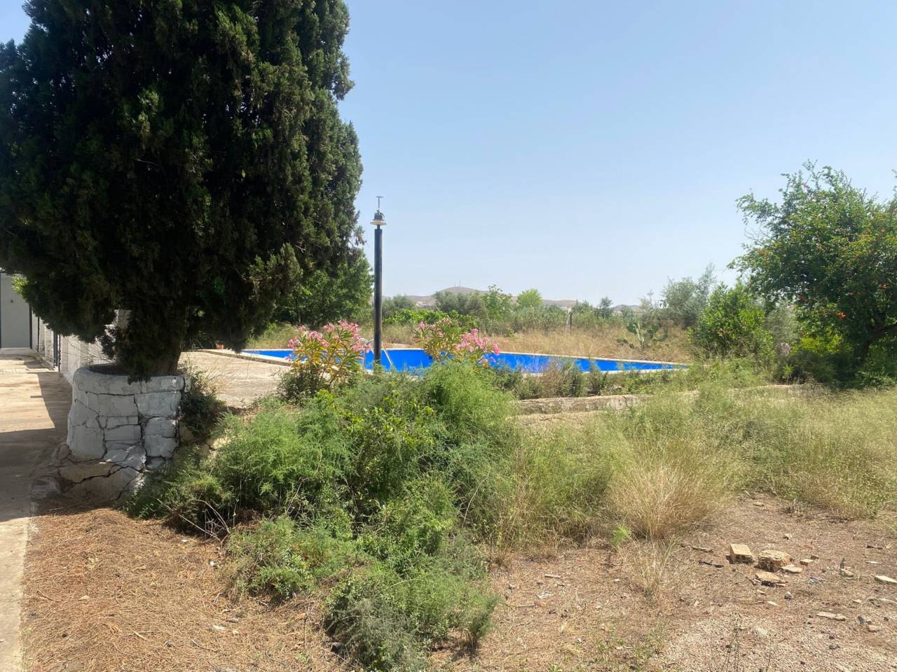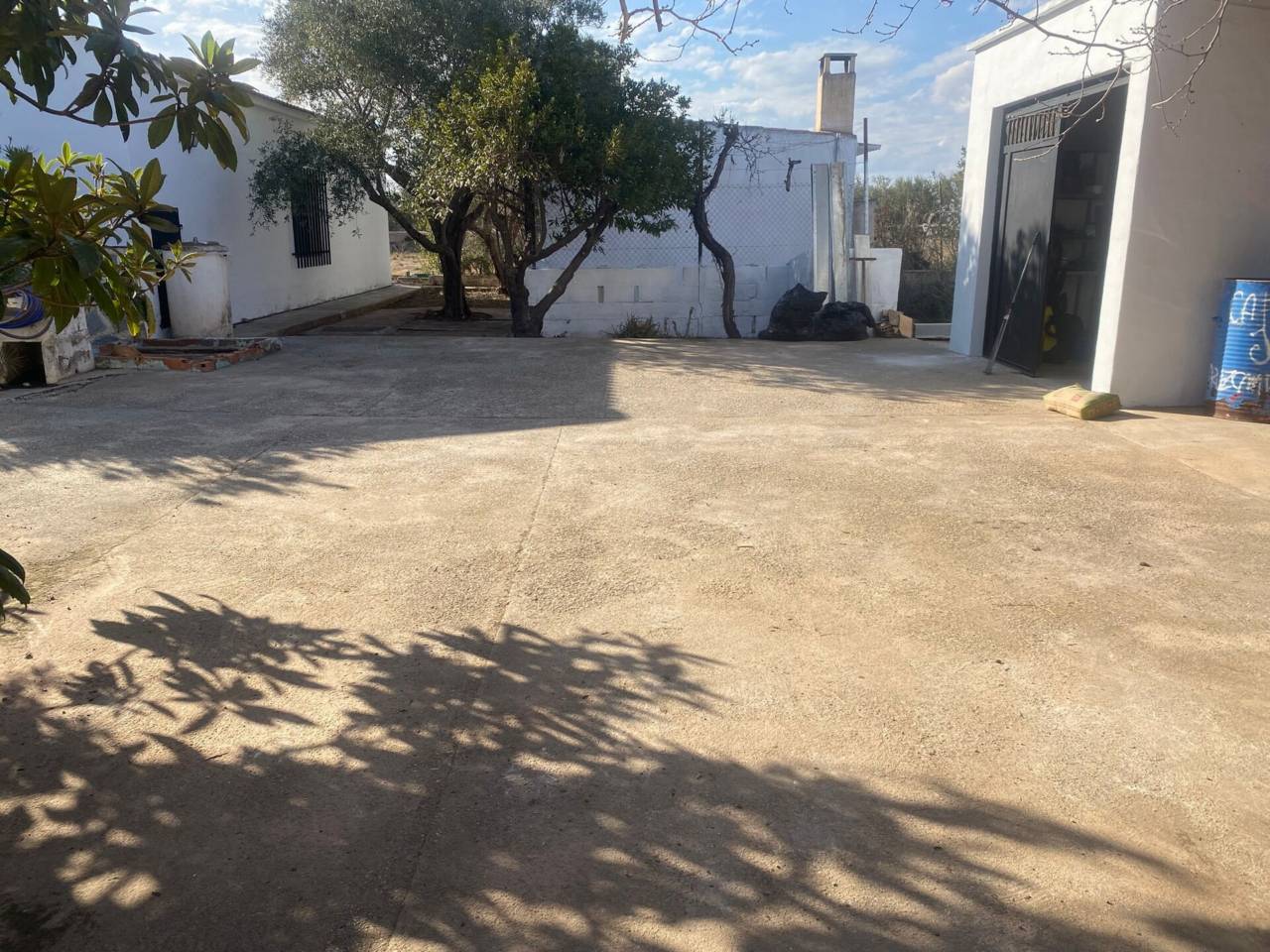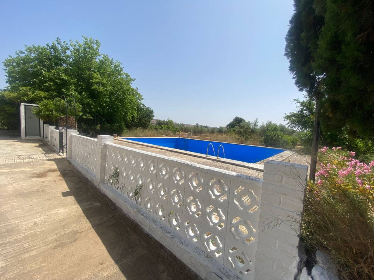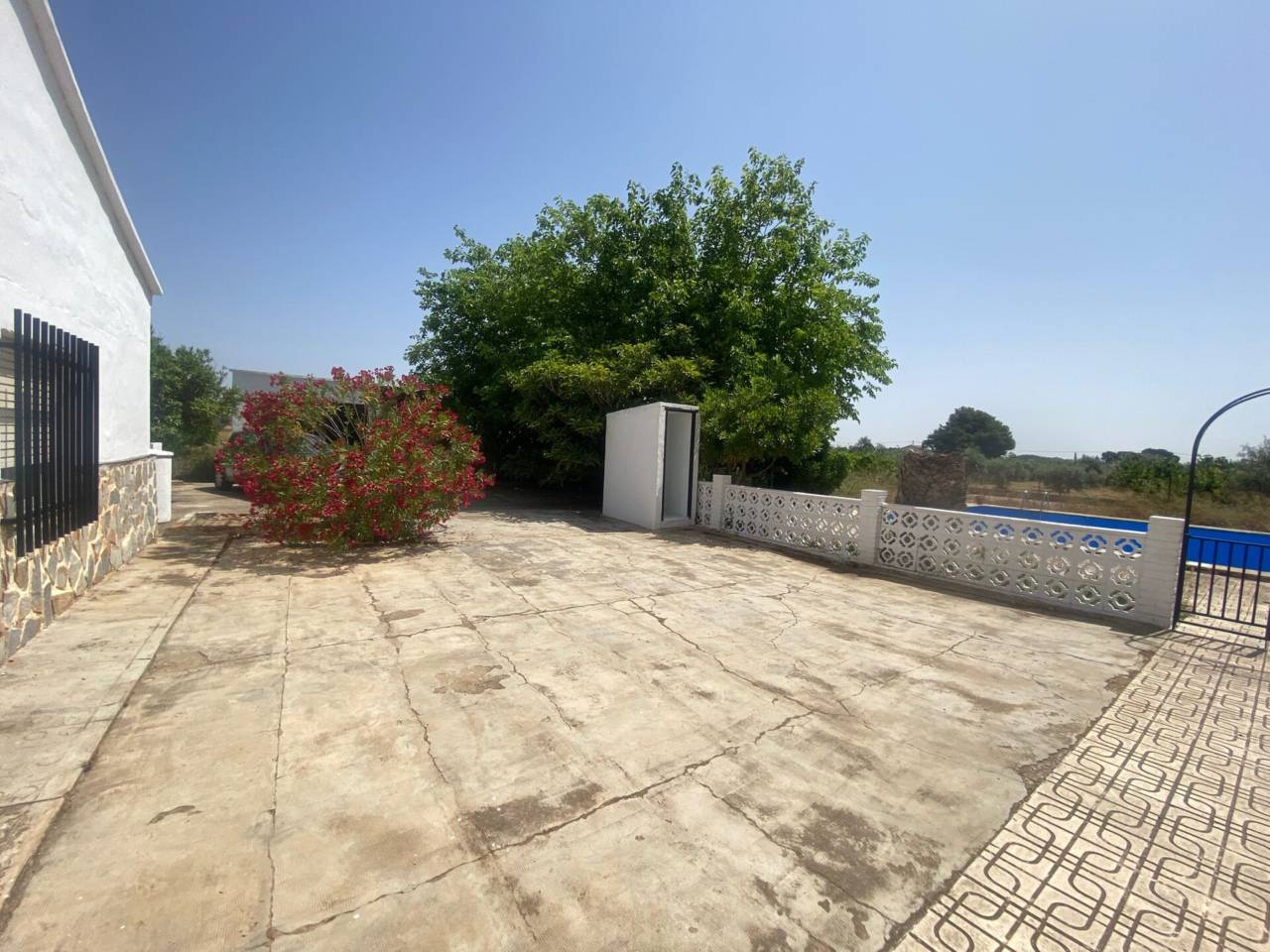 Casa de campo de una planta con parcela de 3.300 m2. En la parcela se encuentra la casa de 150 m2 que se distribuye en 5 habitaciones, cocina amueblada con despensa, salón-comedor con chimenea, baño y aseo. Patio interior amplio. Los suelos son de gres y terrazo, las puertas de sapelli y las ventanas de aluminio y de hierro. Rejas en las ventanas. Piscina con depuradora. La parcela está vallada.